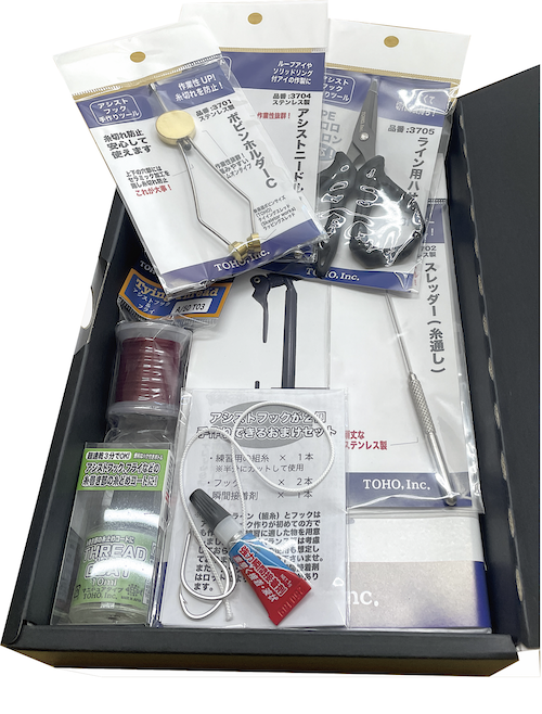 練習用としてアシストフックを2個試しに作ることができる練習用のアシストライン(組糸)とフック、瞬間接着剤もオマケとして付いているのでお得感たっぷりです!