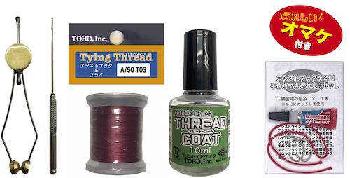 「おまけセット」(練習用の組糸(25cm)×1本、フック(#1)×2本、瞬間接着剤(1g)×1、虎の巻)アシストフックの作り方はこちらから