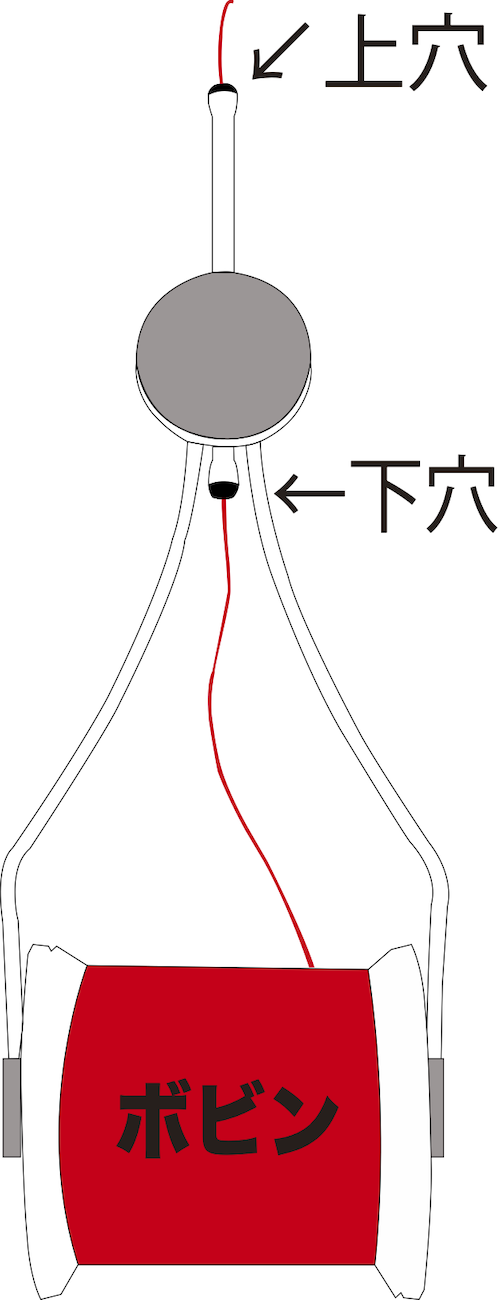 ②スレッダーの先端を上穴→下穴方向に通す
