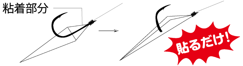 ●面倒な糸巻き作業も必要なく、鈎に貼るだけでサビキ仕掛けが完成!
