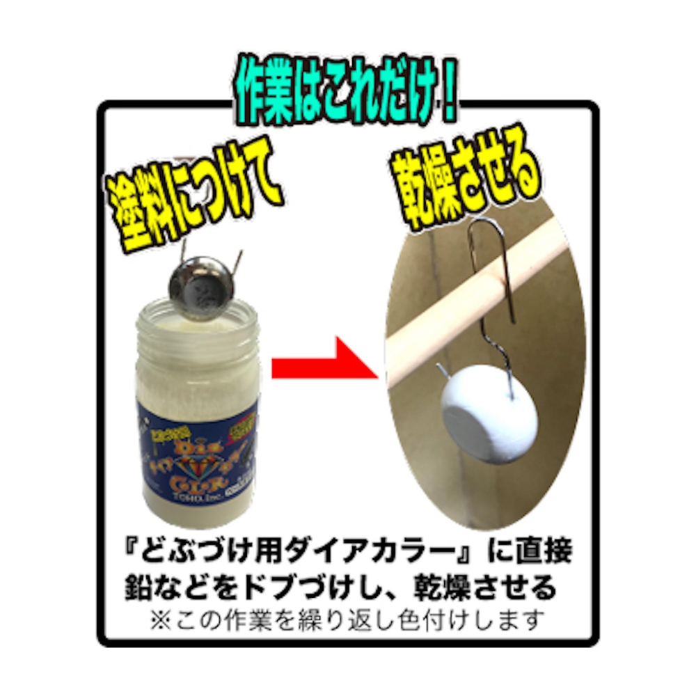 ●鯛ラバヘッド、ジグヘッド、オモリなどを直接塗料に漬けるだけなので、非常にキレイに仕上げられ、塗料に不慣れな方でも簡単キレイにカラー塗装が出来る!