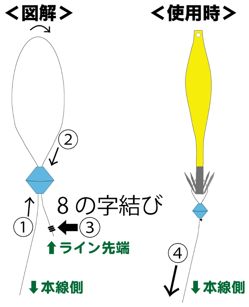 ④使用時は出来た輪をスッテのカンナに引っ掛け、本線側のラインを引っ張ってラインを締め込み、外す時はビーズを引っ張り輪を緩めて外す