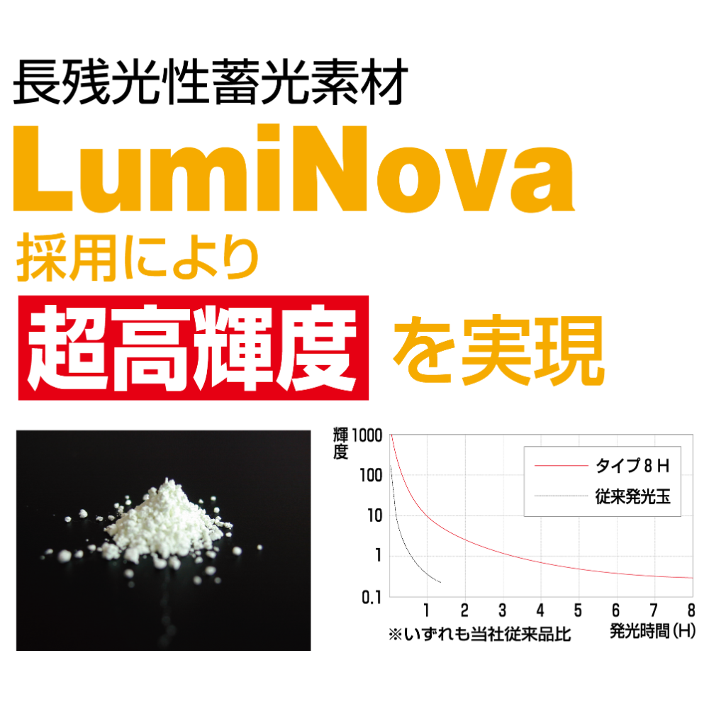 | NO.0370/8Hグリーン | NO.0375/8Hブルー | 長残光性蓄光素材の世界的シェアを有する日本のトップメーカー「根本特殊化学」社製「LumiNOVA」を採用。 その性能は、発光輝度、発光持続時間ともに従来の蓄光顔料をはるかにしのぐ。 |