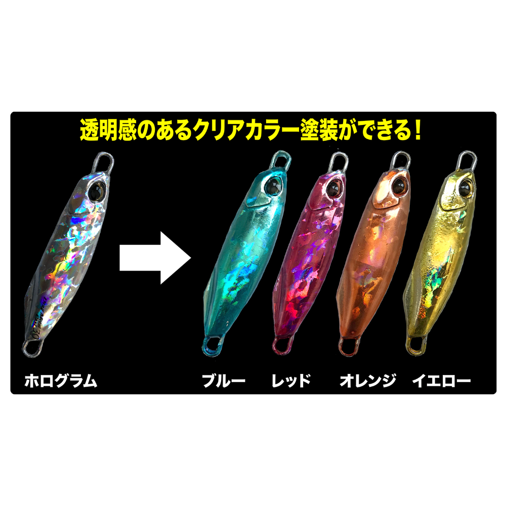 | NO.0386/ブルー | NO.0387/レッド | NO.0388/オレンジ | NO.0389/イエロー | 写真は適合クリアコーティング剤に本品を約5%の割合で混ぜたものを、市販のホログラムのメタルジグに各カラーでどぶづけコーティングした状態です。 下地のホログラムの輝きも残った塗装となっております。 |