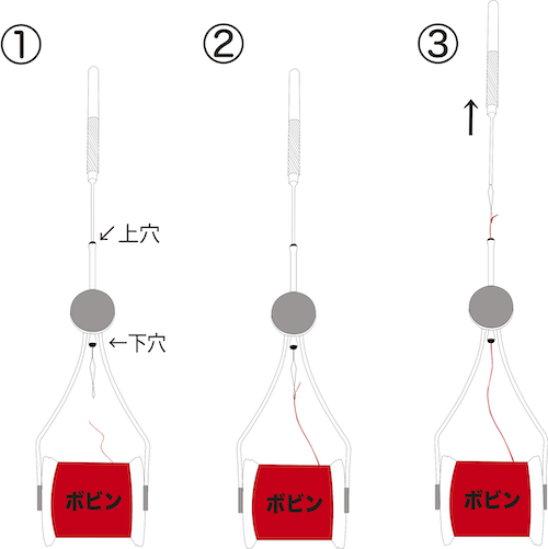 ②スレッダー先端に糸を引っ掛ける